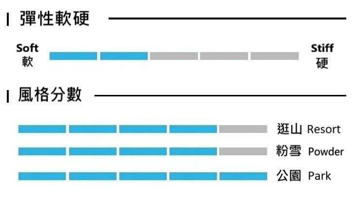 - 在板頭和板尾戰略性的插入碳纖維,使雪板更具反應力,且增加彈力和剛性,同時也增進了減震特性