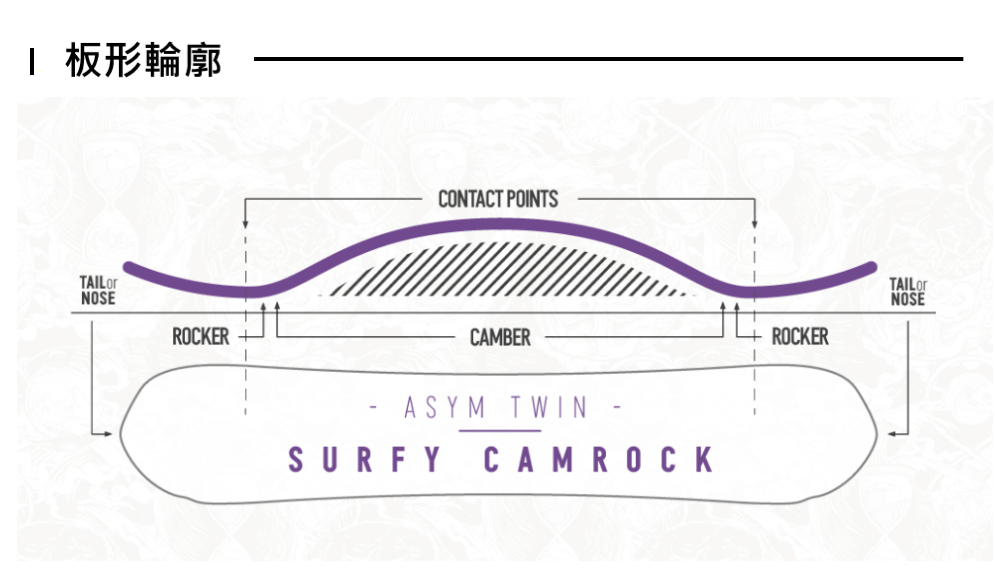 我們的 Surfy CamRock 板型在像是兩腳之間裝有彈簧,並延伸了板頭 Rocker 輪廓,幫助 Alpha 輕鬆剷平路面顛簸,並輕鬆穿過深雪