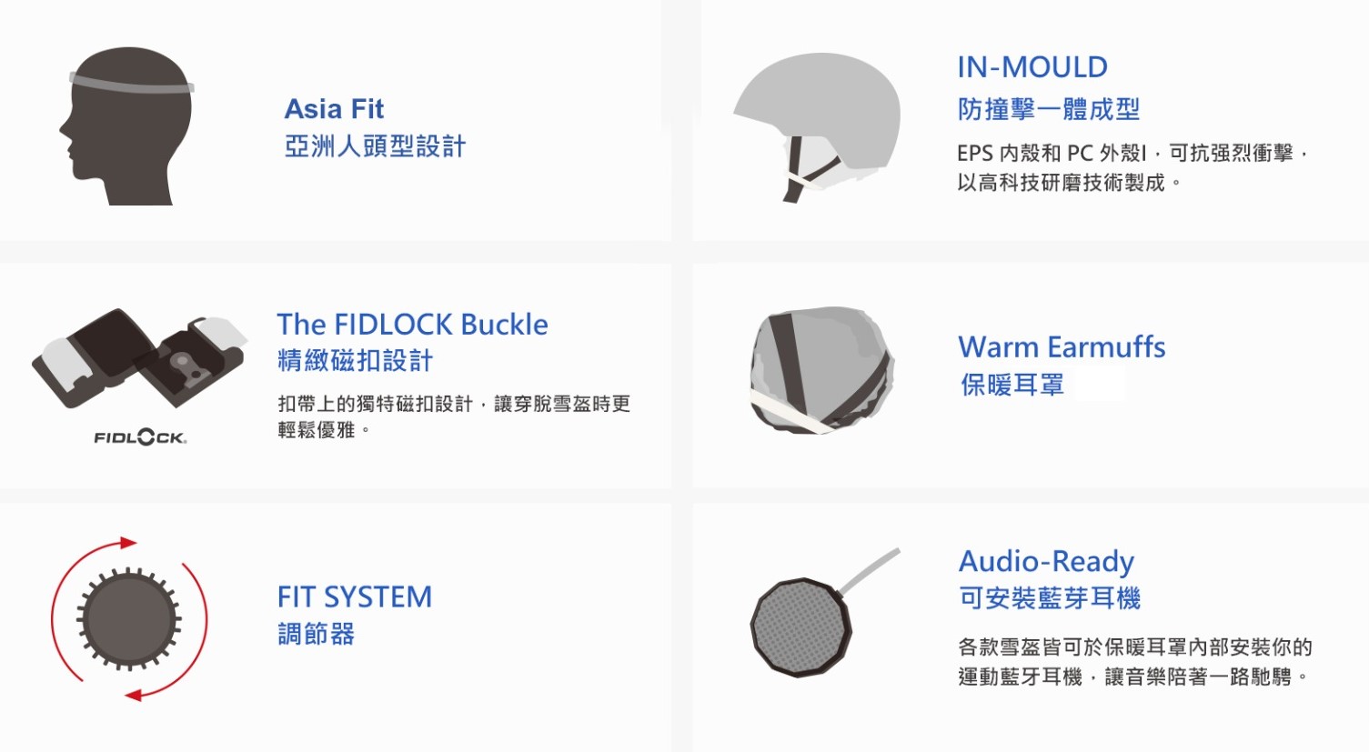 專為亞洲頭型(ASIA FIT)及膚色開發,防撞擊一體成型IN-MOULD EPS内殼和PC外殼可抗强烈衝擊,