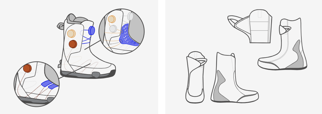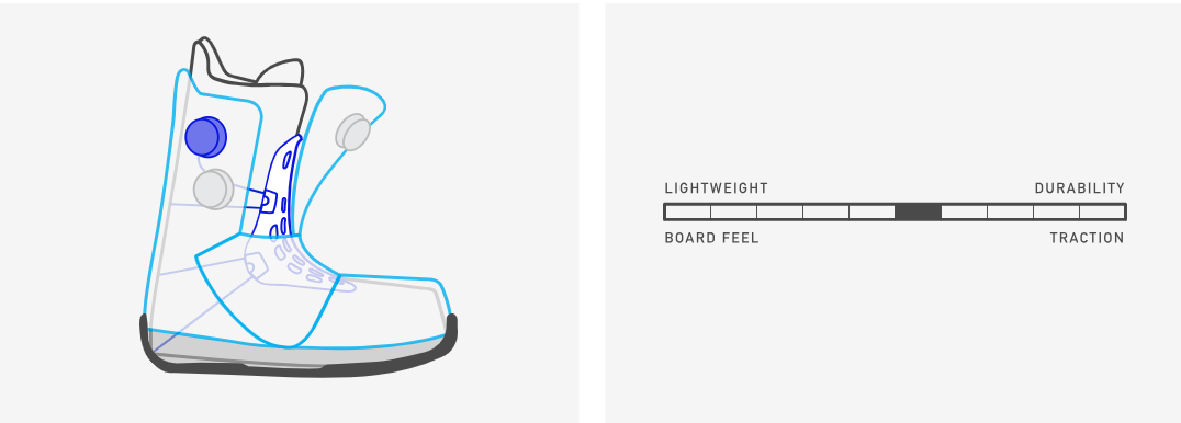 非對稱 Asym Life 內襯 採用輕量且可熱塑的泡棉材質,兼具極佳的耐用性與舒適度。非對稱包覆式鞋筒設計搭配黏貼式魔鬼氈固定,,帶來穩固貼合與卓越的操控感。
