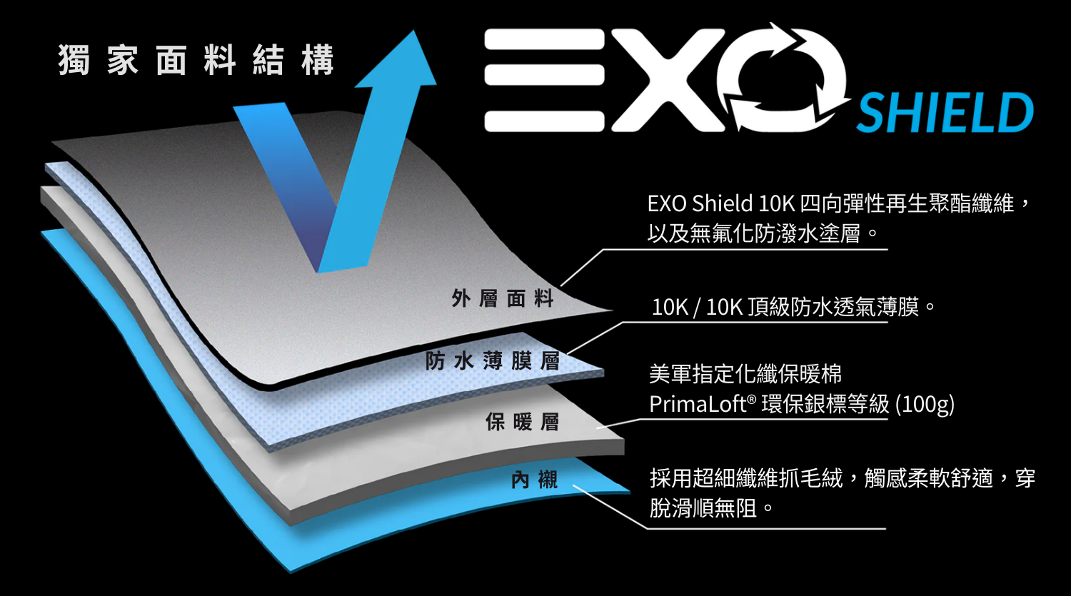 EXO Shield 10k 彈性再生聚酯平紋織物,採用 10k/10k 防水透氣 + 不含 PFC 的 DWR 塗層