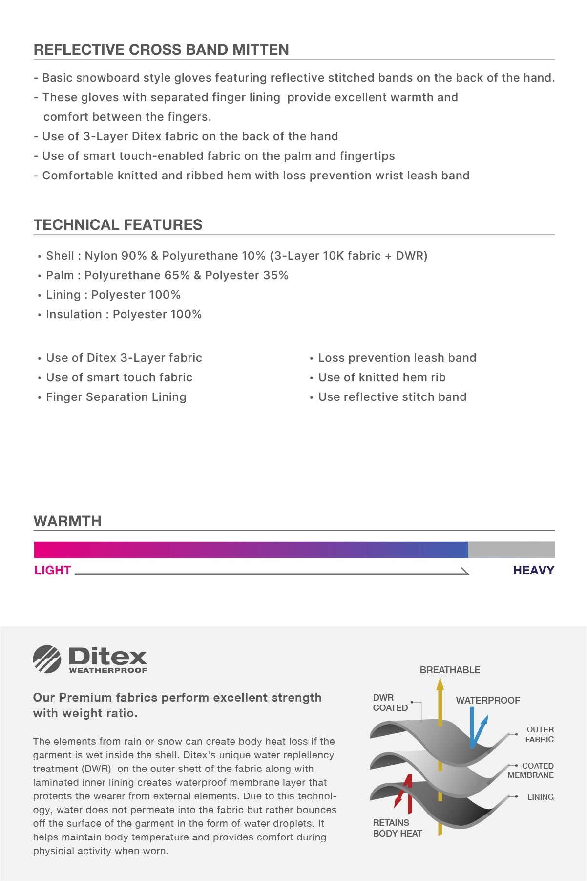 • 手背採用三層 Ditex 機能面料,具備優異的防水與透氣性能