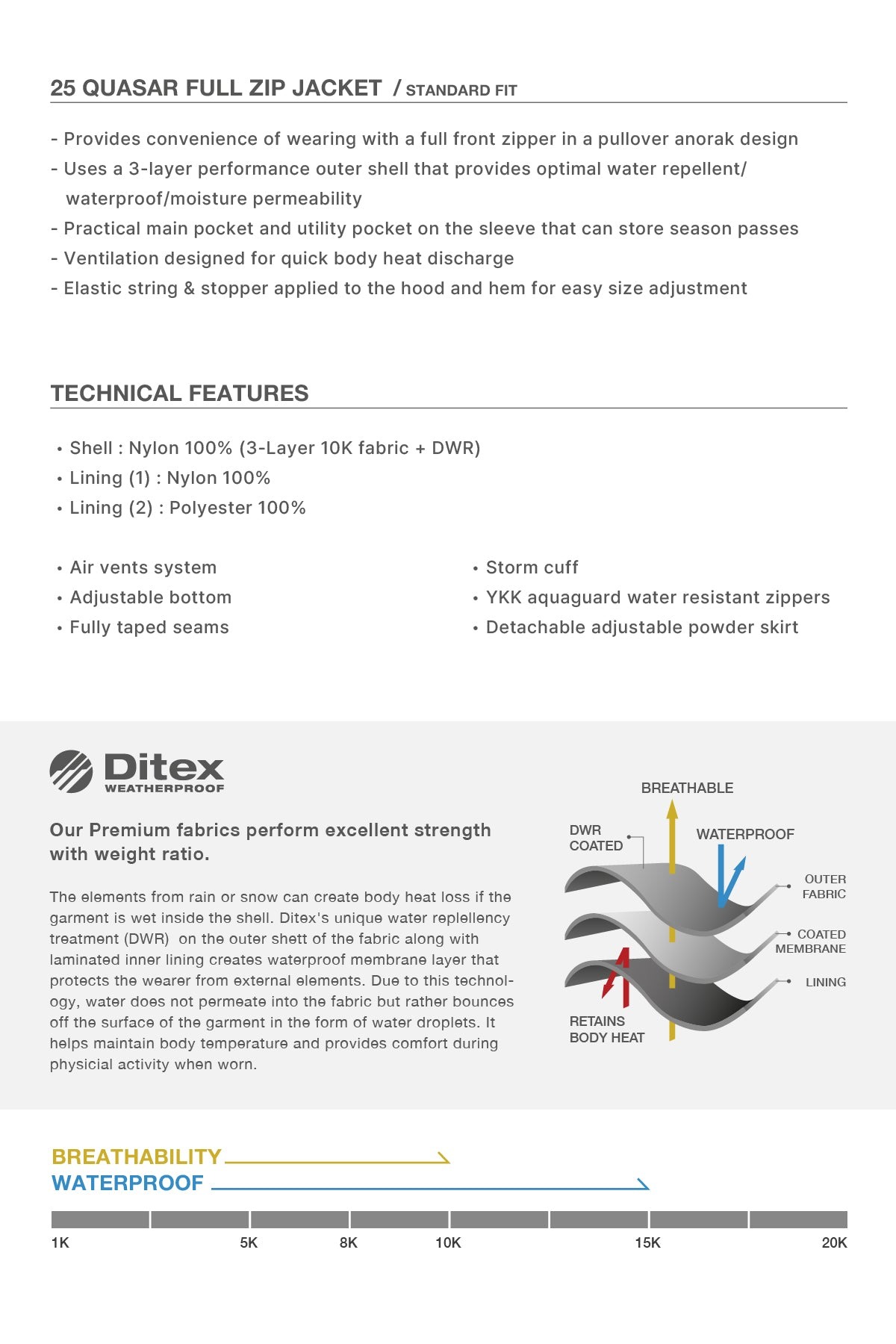 Waterproof : 15K / Breathability : 10K