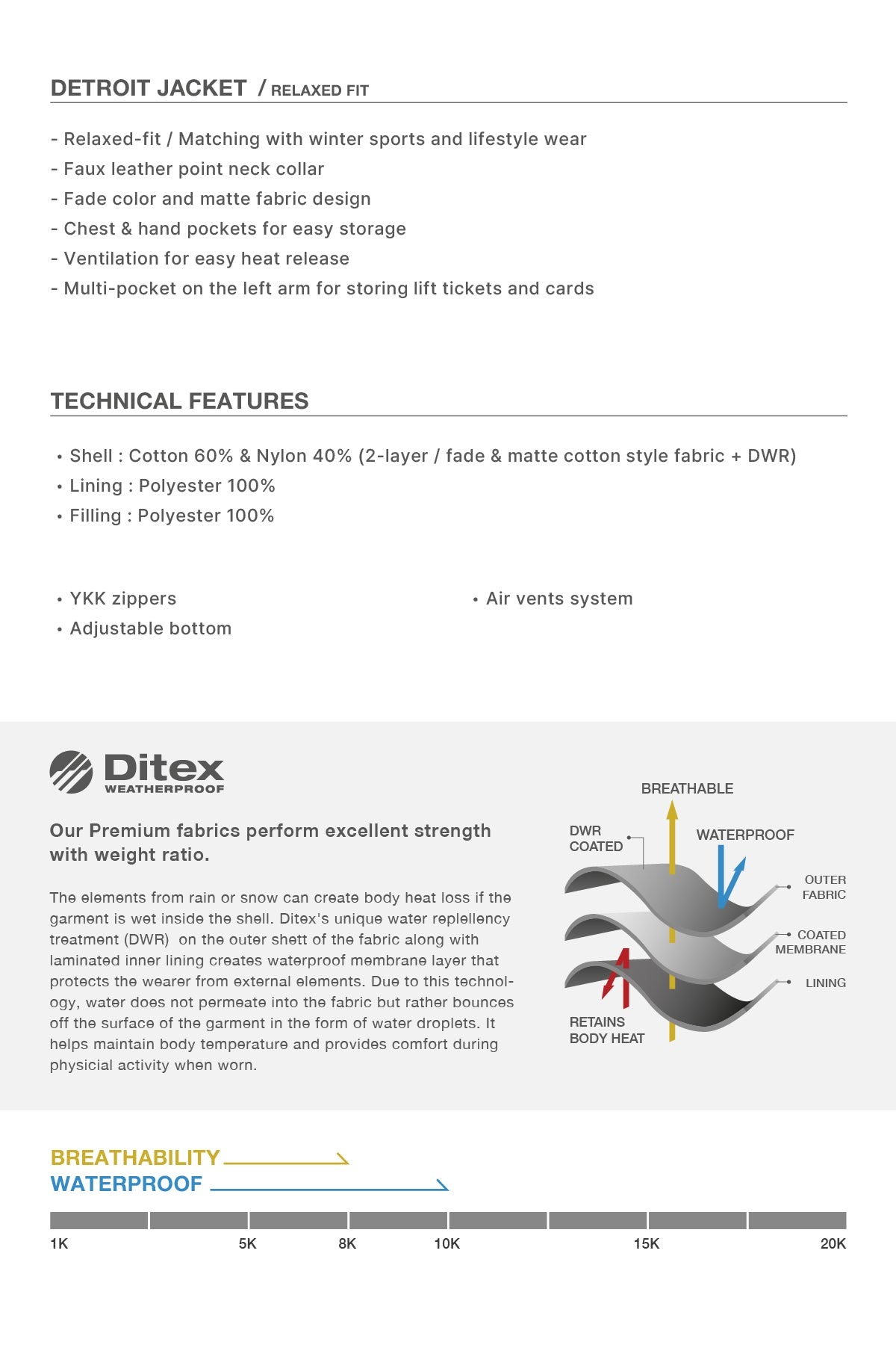 • Ditex 布料具有一流的抗水性和防水/透氣性能