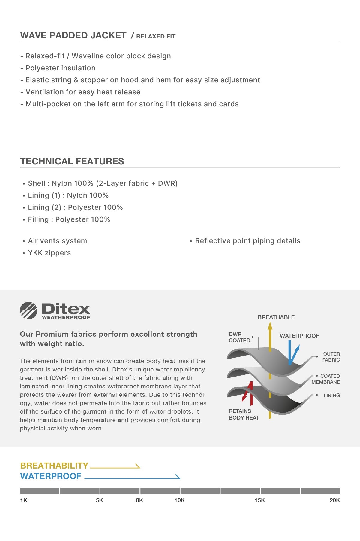 • Ditex 布料具有一流的抗水性和防水/透氣性能