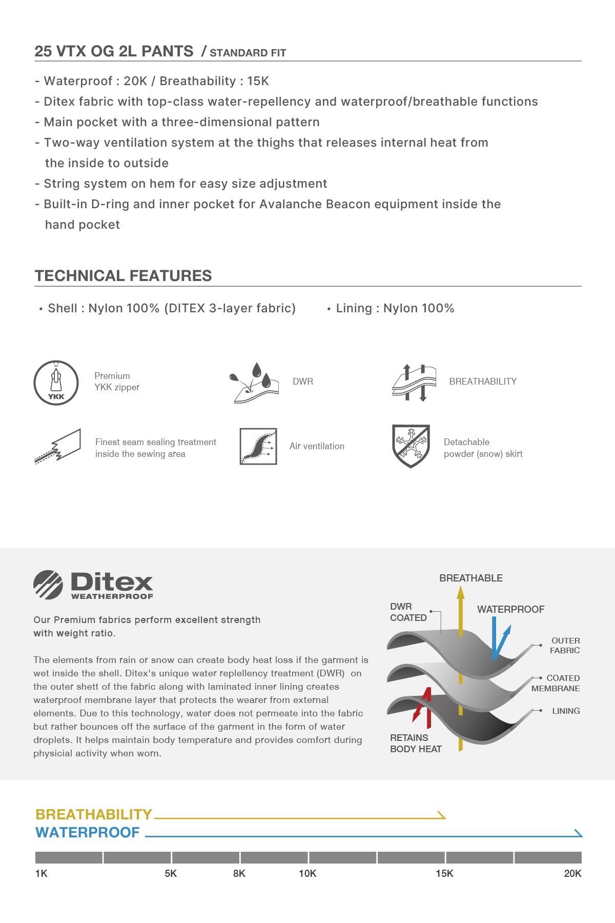 Waterproof : 20K / Breathability : 15K